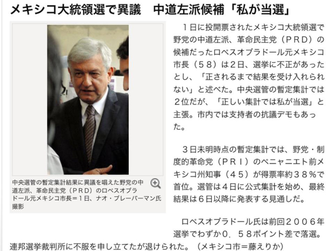 Medios japoneses como el Mainichi Shinbum, medios estadunidenses como el Washington Post y hasta la BBC de Londres, han estado informando de las evidentes irregularidades registradas antes, durante y después de las elecciones para elegir al nuevo presidente de México y que el actual gobierno, así como la mayoría de los medios de comunicación han decidido ocultar, dando como triunfador al candidato Enrique Peña Nieto, abanderado del PRI, partido político reconocido por ser extremadamente corrupto y represor, dando lugar nuevamente a la percepción generalizada en la población mexicana de un nuevo intento de fraude electoral, que hace seis años se llevó a cabo contra el candidato de las izquierdas progresistas, Andrés Mauel López Obrador (AMLO), quién lucha por instaurar una verdadera república democrática en el país.